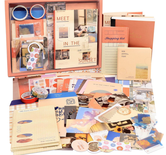 Aesthetic Scrapbook Accessories Kit – Comes with A6 grid notebook (256page), vintage poster book cover, washi/PET sticker*8 sheets(179pcs), note paper*60(3 types*20), envelope*2(5.1in*3.34in),scrapbook paper*20(10 sheets:6.5in*20). 3. 15, 5 sheets:5.9in*5.9in, 5 sheets:8.34in*6.3in),folding laber*10(6.6in*1.77in), card*15, paper photo frame*5, calender stickers*31, washi tape*2(0.4in*78.8in).This kit has everything you need!
